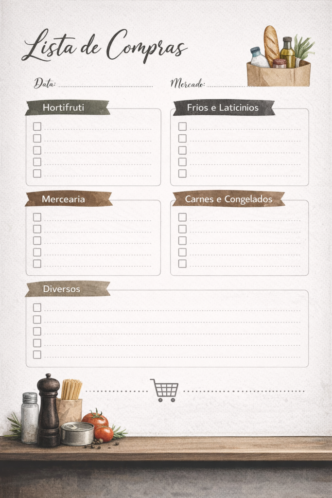 Criei essas listas pra imprimir quantas vezes quiser e usar como um bloquinho mesmo. Daqueles que ficam na cozinha, na bolsa ou na gaveta, prontos pra salvar a próxima ida ao mercado.